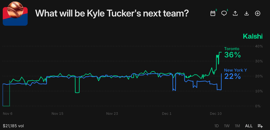 Here are the current odds for Kyle Tuckers' next team (via Kalshi, updated every 30 minutes):