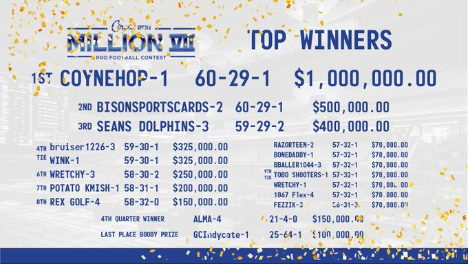 Circa Million calls for entrants to make five NFL picks each week against the spread. Coynehop-1 squeaked out the season-long win and $1 million first prize by winning a tiebreaker.