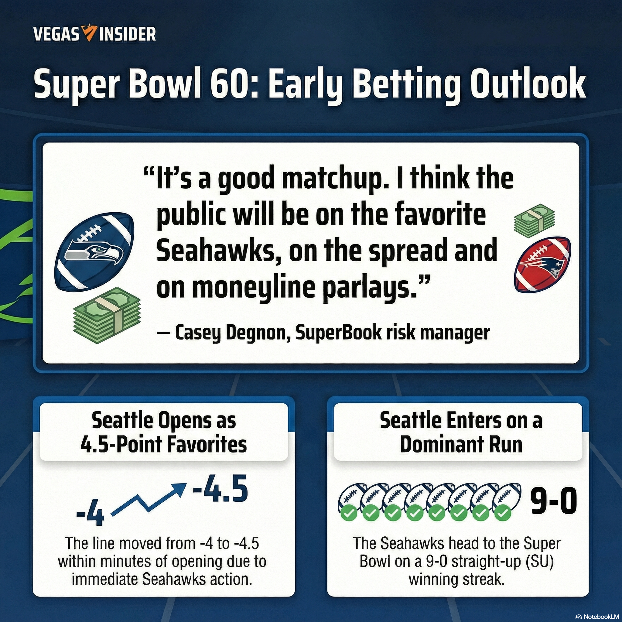 "It's a good matchup. I think the public will be on the favorite Seahawks, on the spread and on moneyline parlays," SuperBook risk manager Casey Degnon said. "The market is already starting to go up. It's all Seahawks so far."
