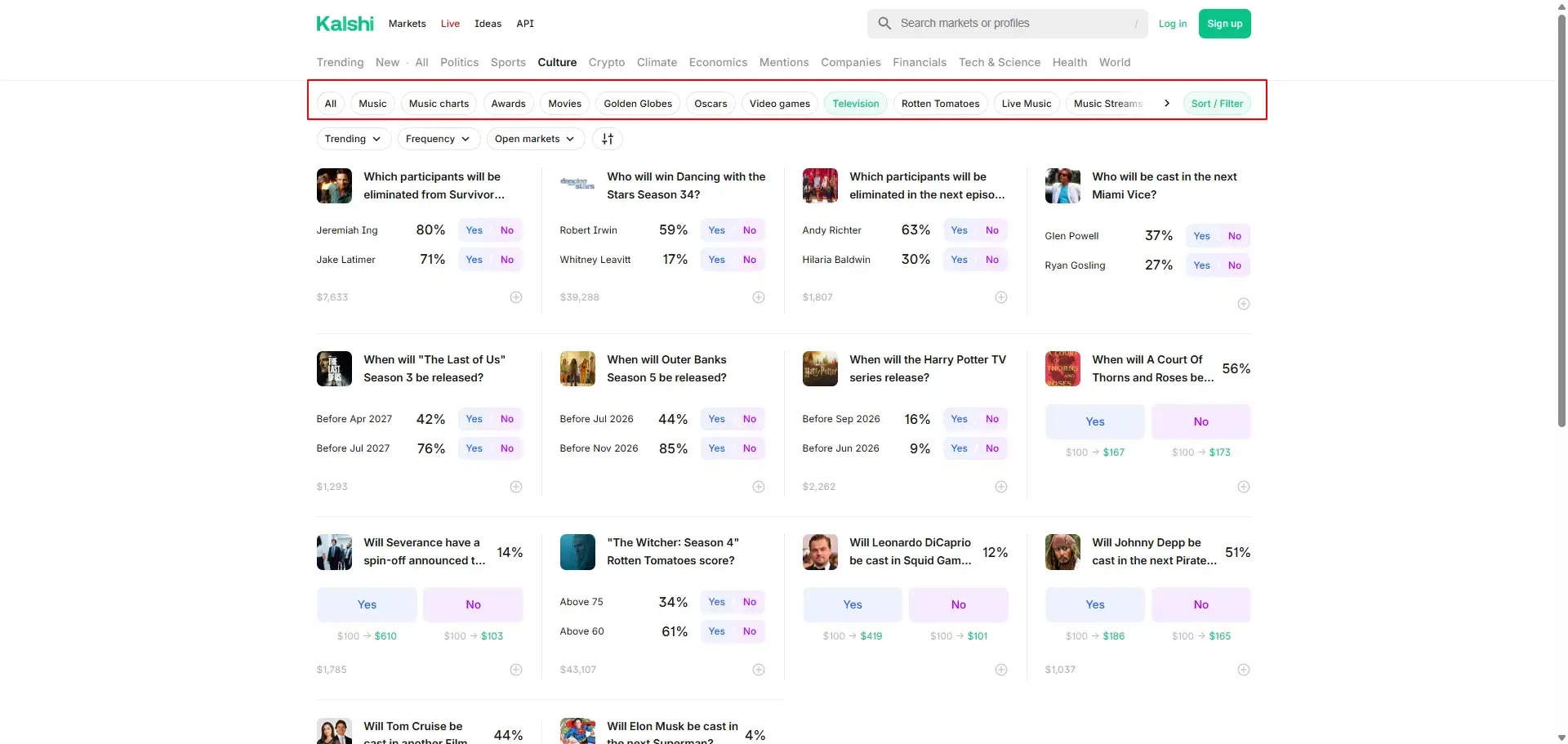 - TV show speculation. Kalshi also lets you predict outcomes on popular TV shows in every way possible. For example, you might see markets asking "Which participants will be eliminated from Survivor Season 49 Episode 3?" or "Who will be cast in the next Miami Vice?" or even "When will The Last of Us Season 3 be released?" It's a fun way to turn your TV knowledge into actual dollars while you're watching these shows.